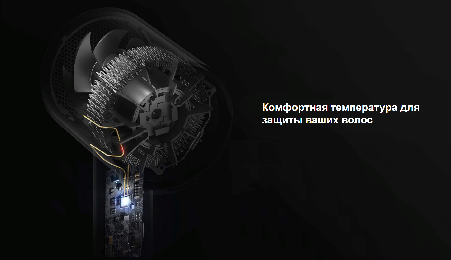 Температура определяется 60 раз в секунду, и результат напрямую отправляется на микропроцессор для регулировки температуры воздуха в режиме реального времени и проверки стабильной температуры на уровне 57 ℃. Интеллектуальный контроль температуры позволяет предотвратить повреждение волос и поддерживать их здоровый блеск.