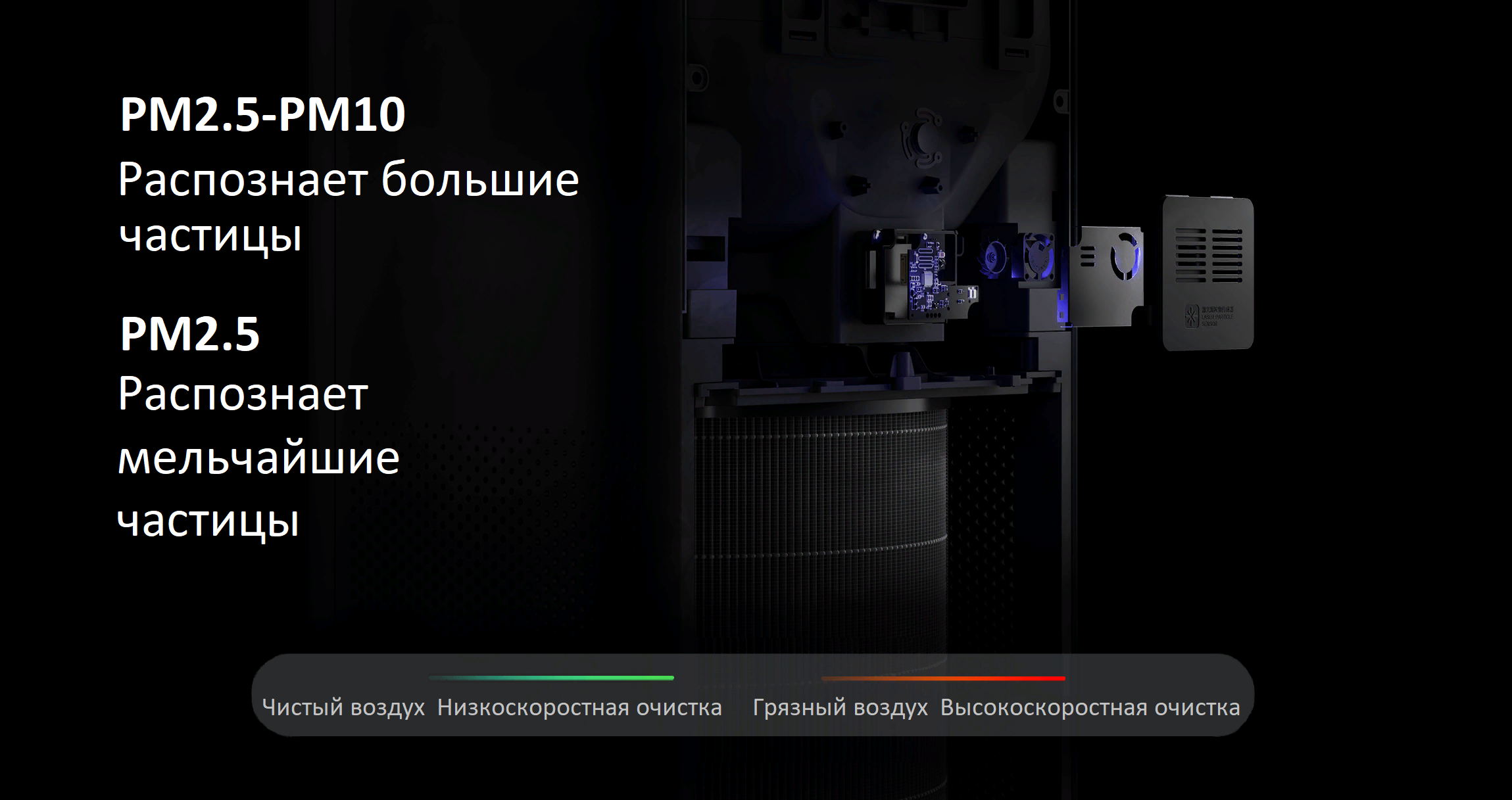 Удобные сведения о качестве воздуха в режиме реального времени, отображение концентрации PM2.5/PM10 и цветовая полоса. Настраивайте параметры очистки простыми сенсорными кнопками согласно своим потребностям в очистке воздуха.