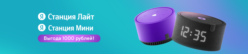 Умная выгода при покупке Яндекс.Станции Лайт или Яндекс.Станции Мини. Приобретайте портативные колонки со скидкой 1000 рублей! Акция действует с 21 июня по 4 июля.
